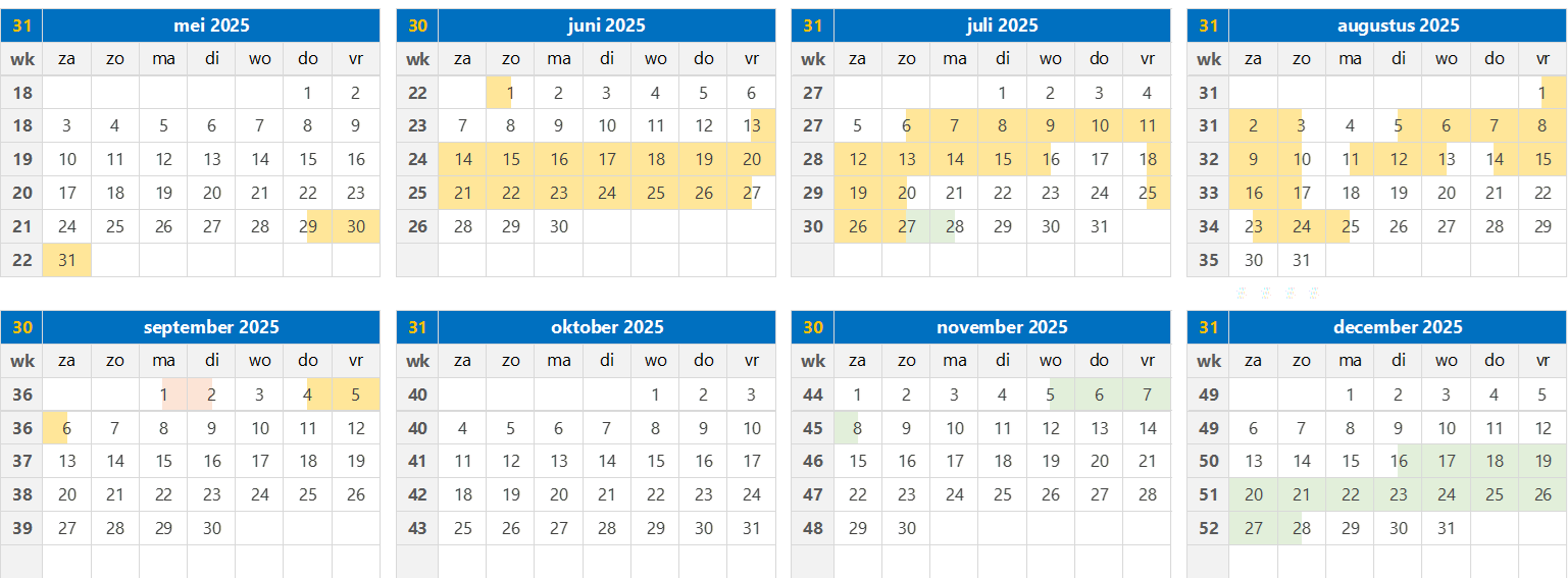 Hieronder vind je de beschikbaarheidskalender voor 2025. De 'vrije dagen' zijn beschikbaar. (De dagen die in een kleur gemarkeerd staan, zijn reeds geboekt of niet beschikbaar om een andere reden.)